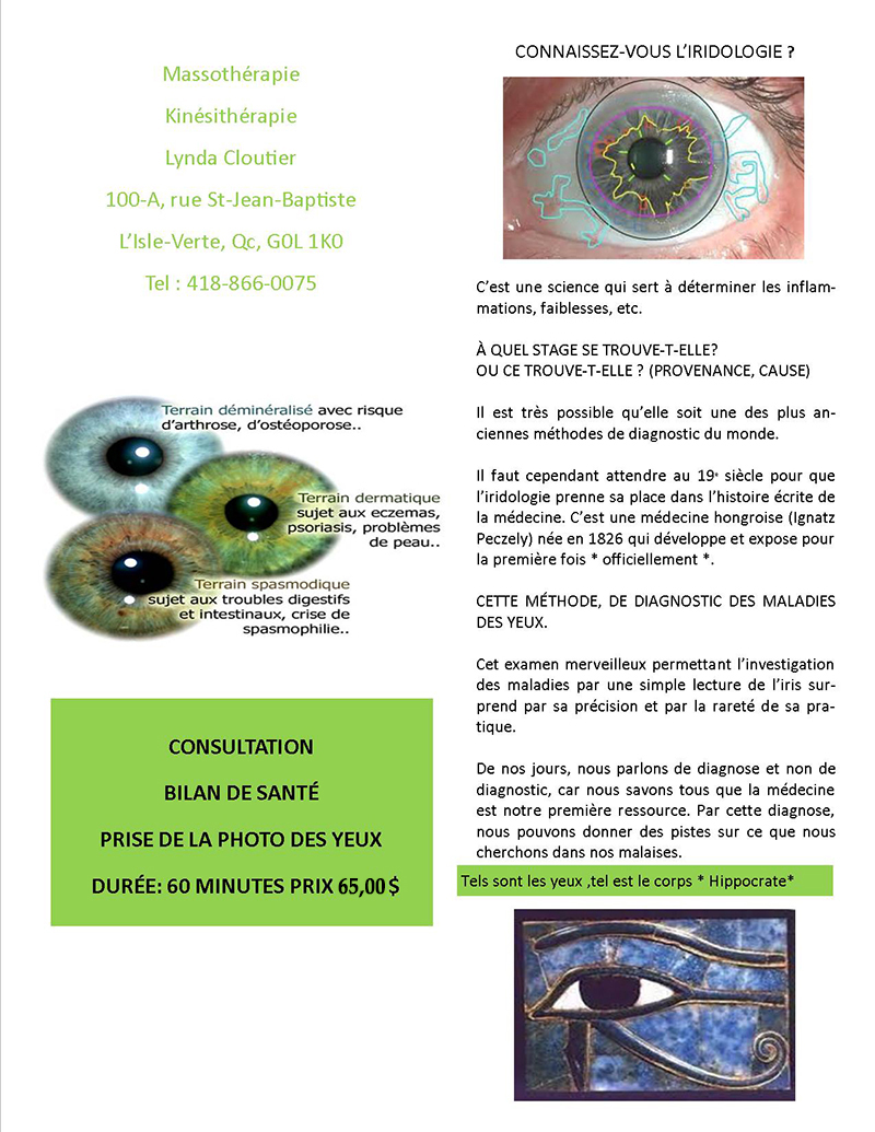 1re rencontre avec bilan de santé et iridologie: 90 $